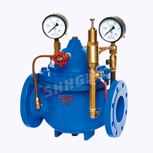 減壓穩壓閥(可調式減壓閥)由主閥、導閥、針閥、球閥、微型過濾器和壓力表組成水力控制接管系統。使用時,當調定出口壓力后,能自動保持穩定出口壓力。